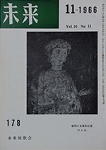 岡井隆 – 戦後のうた (12) ・ 近藤芳美 – 豊島園私記 (十) / 青木郁子他 - 作品 (一) / 河野愛子 – 中村憲吉 ・ 吉田漱 – わがうちのアルカディア(30首) ・ 金井秋彦 - 月評・K-0192 ・ 大家増三 – 下関(30首) ・ 吉田漱 - 島木赤彦 ・ 大島史洋 – 幻夢百人浜(15首) ・ 長谷尾良子他 - 作品 (二) / 1965年未来年間賞発表 / 岡井隆・我妻泰 – 工房月旦(第四回) / 雑記 ・ 編集後記 - 岡井隆 / 表紙 – ボイアナの壁画 ・ 表紙構成 - 吉田漱 / 編集発行人 - 近藤芳美 / 発行所 – 未来短歌会 / 印刷所 – 一光印刷所 / 定価150円 |